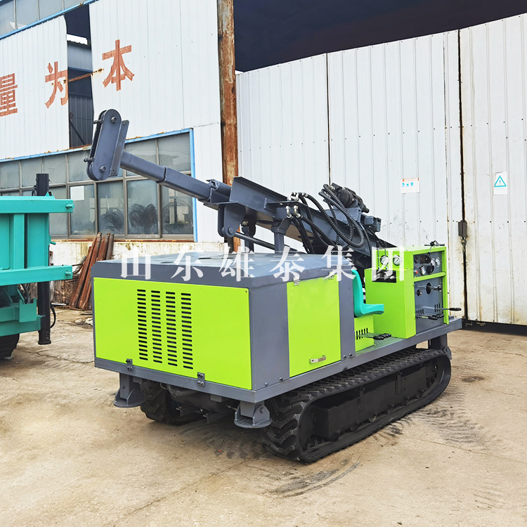 The crawler-type full-hydraulic drilling rig is composed of a power unit and a hydraulic system, a crawler walking mechanism, a drill frame equipped with a hydraulic rock drill and a propeller, a support arm, and a drill pipe connecting and unloading device.